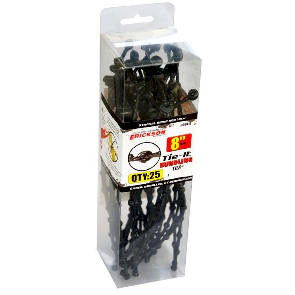 Erickson 06810 contains 25 of the 8 in. Tie-It Bundling Ties. You can never have too many. Tie-It Bundling Ties are innovative rubber straps designed to bundle things together. These new, easy to use bundling ties will replace your old cable ties and zip ties. The bundling ties are made of a durable rubber compound to give it the stretch it needs to wrap around almost anything. Use the bundling ties to secure hoses, extension cords, loose objects (like extra ratchet strap webbing), or use for cable management, and other DIY projects or organization. Erickson bundling ties are UV Protected and can be used in all weather conditions. Simple and Easy to use. Just wrap your article with the rubber bundling strap, stretch, and put the ball in the glove. To remove, just stretch and release. If you need to secure something long term, Erickson's 14 in. and 24 in. bundling strap models come with an eye so they can be attached permanently. As a leader of Tie-Down and Towing Products in North America, Erickson strives to provide the safest products available with the consumer in mind. Tie it. Tow it. Load it. Count on Erickson.