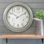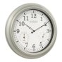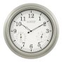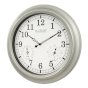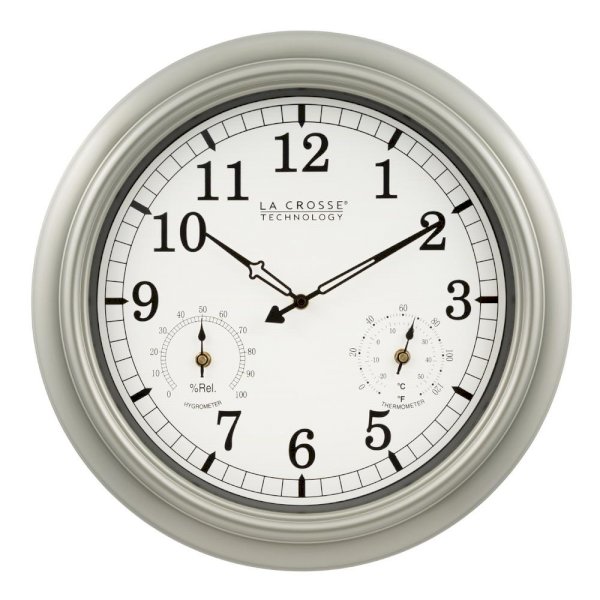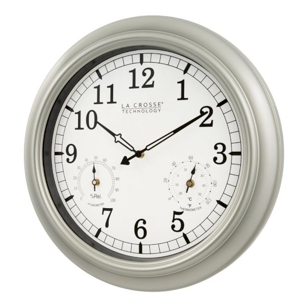 La Crosse Technology's Indoor/Outdoor Wall clock is weather resistant and tracks temperature and humidity. This wall clock features an 18 in. metallic finish frame that easily fits into any large living space. Hang it outdoors to add to decor of a patio or lanai.