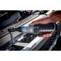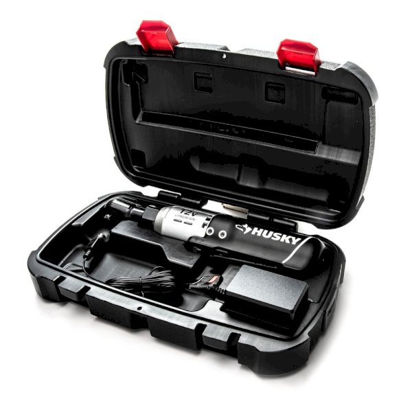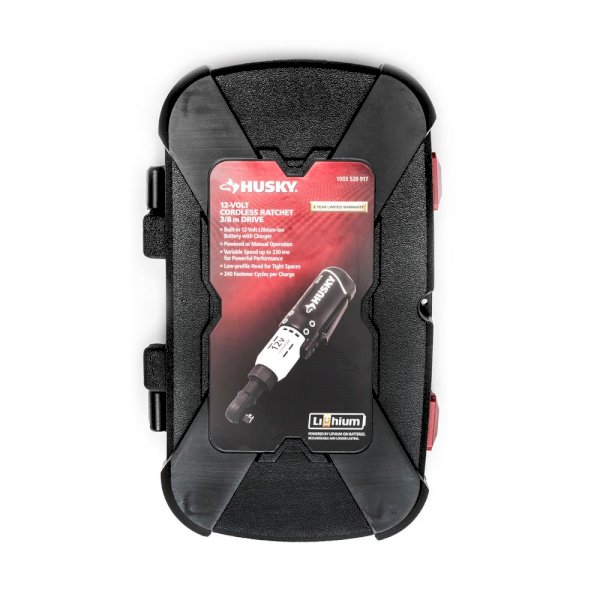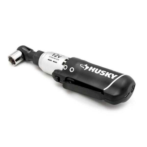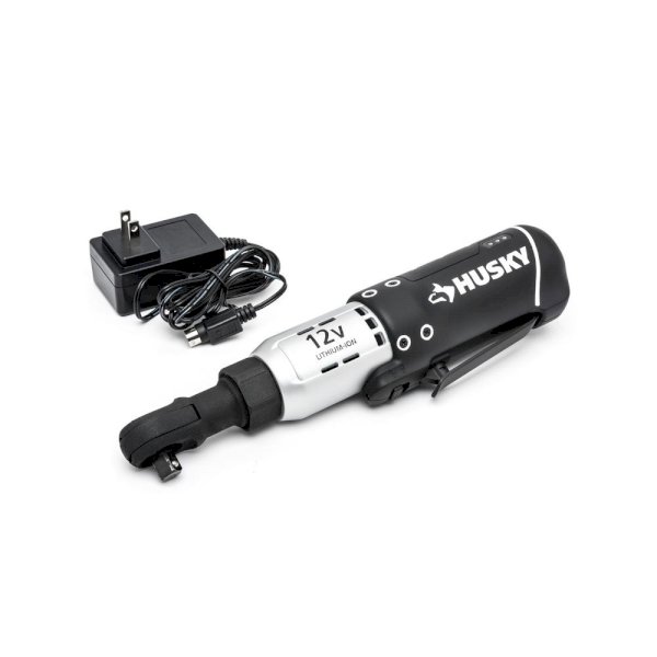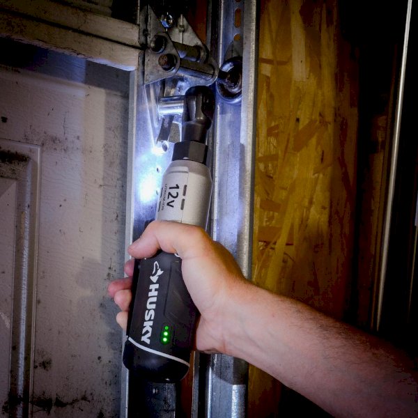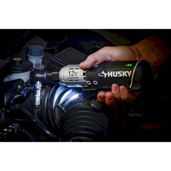 The Husky 3/8 in. drive cordless ratchet features a 12-Volt Lithium-Ion battery that produces 230 RPM. The low profile head and built-in LED lights provide end users with the means to see and access tight working areas. The Ratchet can produce up to 30 ft./lbs. of powered torque.