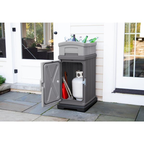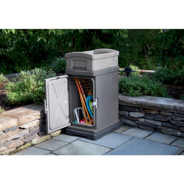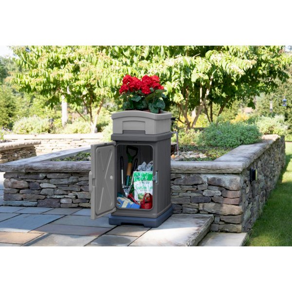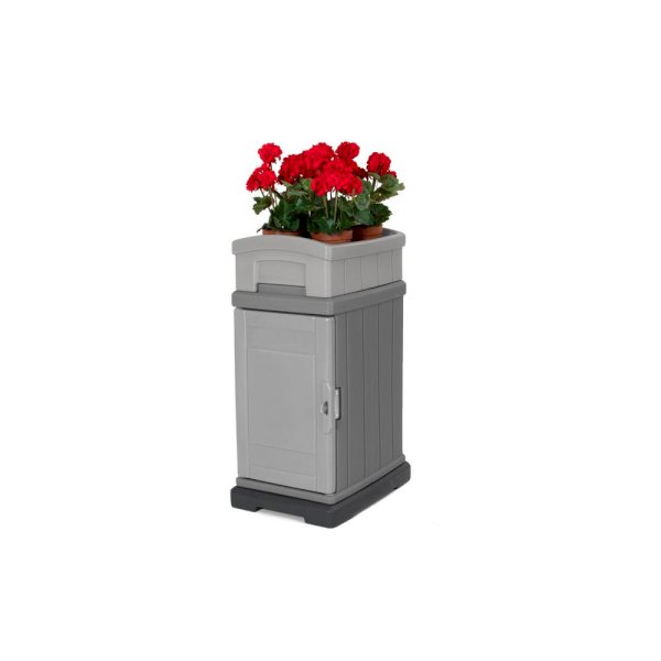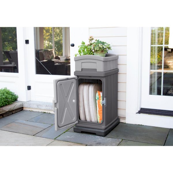 The Hide Away Delivery and Storage Box is a tough, weather resistant home package delivery and storage box with traditional styling that compliments homes while protecting and securing oversized deliveries. Heavy-duty magnetic cabinet door closes securely to ensure that ground and express deliveries are protected from the elements. Planter top for flowers and more.