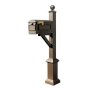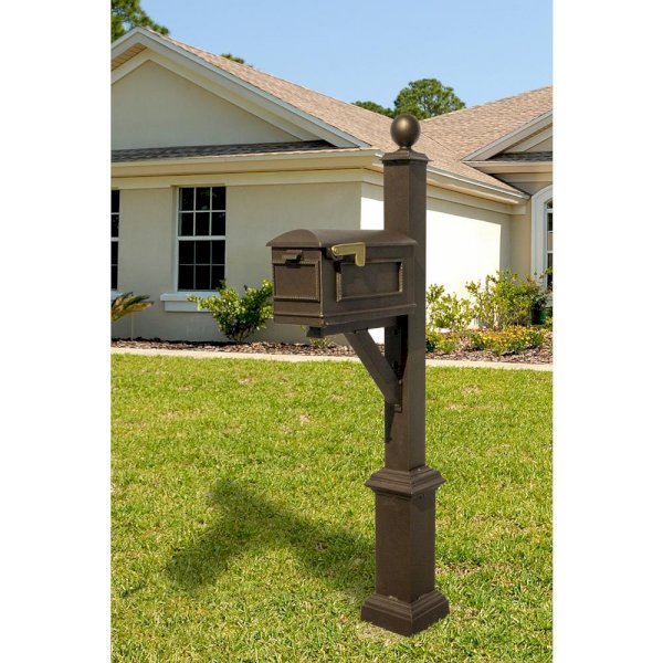 Make a strong statement with our West haven post-and-beam style 4 in. x 4 in. aluminum square Mailbox post systems. Mailbox post system features a durable, low maintenance bronze powder coat finish that will look great for years and comes with a Lewiston Cast Aluminum Mailbox, support bracket, decorative large ball finial and square base. Lewiston Mailbox is non-locking and is made of cast aluminum with a matching powder coated finish. Post mounts directly into ground, system color is Bronze.