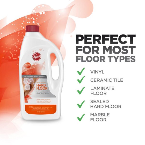 Hoovers Deep Clean Max Hard Floor powerfully cleans and quickly removes stubborn everyday dirt and grime from different types of hard floor surfaces. It's ideal for use in high traffic areas, such as the kitchen or entryways. This solution is designed to allow quick, easy and effective cleaning on sealed hard floors such as vinyl, ceramic tile, laminate floors, sealed hard floors, and marble.