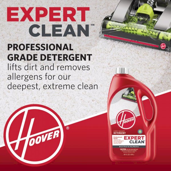 Hoover's Expert Clean Detergent has professional grade strength to ensure removal of deep-down dirt and grime from carpets and upholstery. Compatible for use with any Carpet Cleaner or Spot Remover. The large 64 oz. bottle provides enough detergent for multiple uses.