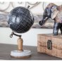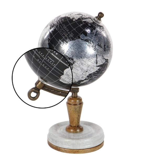 This plastic globe features a lustrous blue and silver surface with matching sturdy iron axis in a metallic brown finish. It features an impressive and detailed world map illustration in thin gray and black outlines that gives a modern touch to the globe. This decorative piece is designed with a traditional brown mango wood post attached to a wooden marble base that is sure to complement your contemporary desks, tables or shelves.