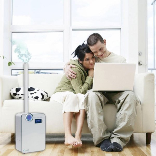 The pure guardian 90-Hour Smart Mist Ultrasonic Humidifier guards against problems caused by dry air in the home, making life pleasant for those with cold, flu, allergies and dry skin. A Smart Mist sensor monitors the humidity level in the room and adjusts accordingly to maintain a consistent humidity level. Silver Clean Protection fights the growth of slimy mold and mildew on the surface of the water tank. Thanks to ultrasonic technology, it is ultra-quiet when it runs making it ideal to have on while you sleep. The humidifier is equipped with the option for warm or cool mist and has a light that turns red to let you know when it’s time to refill the water tank. A timer allows you to customize the desired run time for up to 12 hours. It features a soft glow night light that turns on and off and easy-to-use digital controls.