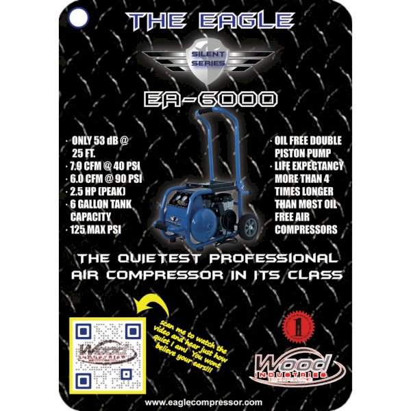 The Eagle Silent Series is geared toward the professional contractor. The EA-6000 is a 2.5 HP (peak) compressor that boasts only 53 dB at 25 ft. It features a maintenance free oil-less compressor head, stainless steel braided discharge tubing, and a 6 Gal. steel tank.