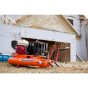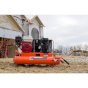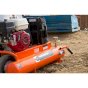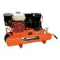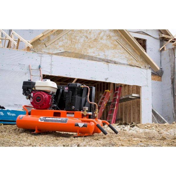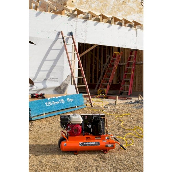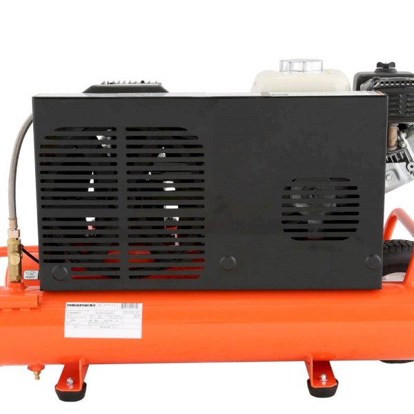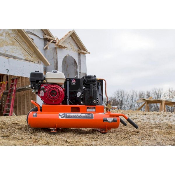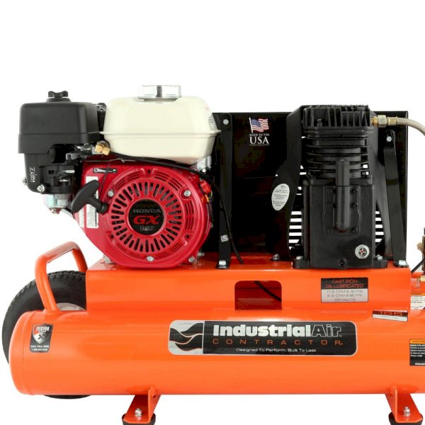 Industrial Air Contractor 8 Gal. compressor has a 5.5 HP Honda engine and an oil-lubricated, twin-cylinder pump that delivers 9.9 CFM at 90 psi for great air tool performance. Mobility is easy thanks to the wheelbarrow design which features low-profile handles and a center-mount, semi-pneumatic tire.