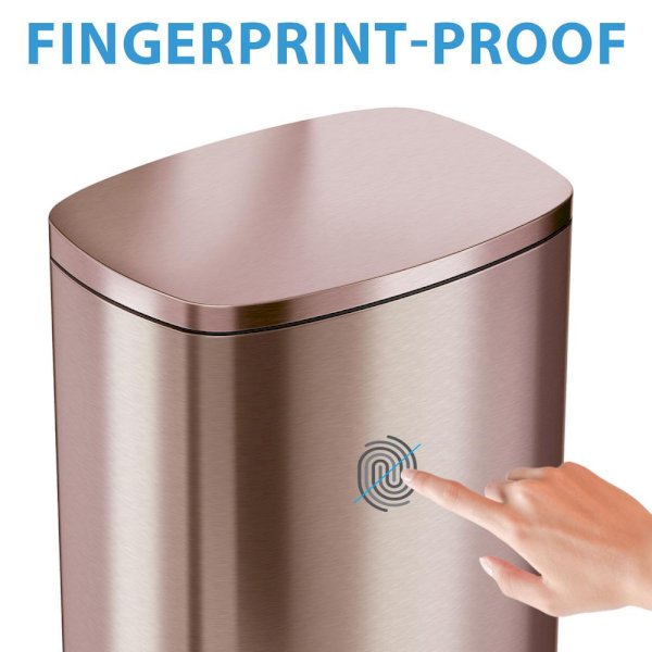 13. 2 Gal./50 Liter Soft Step Rose Gold Stainless Steel Step Trash Can Soft Step is the smoothest, most sophisticated step trash can you will ever own. The ergonomically-designed pedal requires minimal force to operate. The gentle lid close is smooth and silent. The elegant, brushed stainless steel finish is fingerprint-proof and smudge-resistant, making Soft Step the perfect kitchen trash can. The easy to replace air damper means this step trash can will provide years of like-new performance. SoftStep stainless steel trash can is the perfect kitchen trash can. It has a slim, space-saving design, yet its large, 13. 2 Gal. capacity means it can easily hold days worth of trash. The removable inner bucket stops a full, heavy trash bag from falling into the can, and makes taking out the trash quick, easy, and clean. Its rose gold brushed stainless steel finish makes Soft Step the showpiece garbage can you will be proud to have in your kitchen.