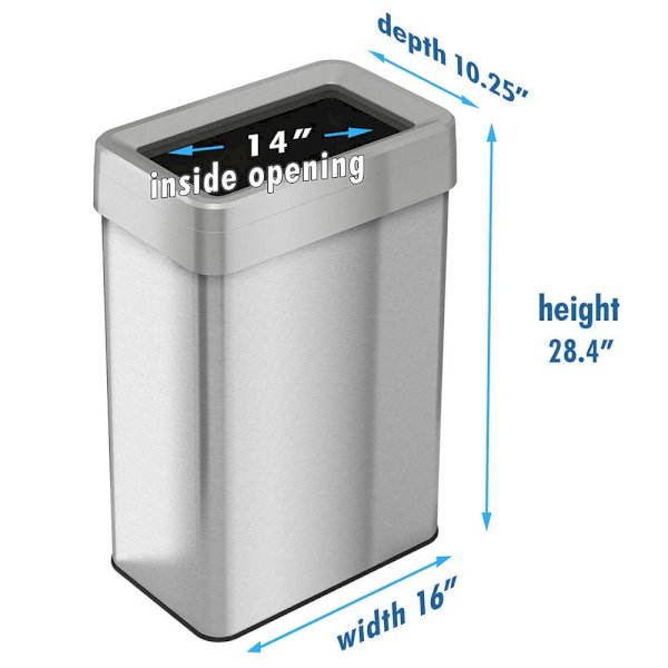 Dispose of trash quickly and easily with this large capacity, 18 Gal rectangular open top trash can with dual-deodorizer. The slim, space-efficient design and wide open top make this the ideal trash can for busy stores, offices, lobbies, and homes. Premium Features: 1-Year Manufacturers Warranty included. Perfect for restrooms, lobbies, stores, restaurants, kitchens, pantries. Slim, space-efficient design fits perfectly in restrooms, against walls, next to tables. Large 18 Gal. Capacity holds lots of trash. Elegant and stylish stainless steel can body is fingerprint-proof and smudge-resistant. ABS plastic lid is durable and easy to clean. Convenient carry handle. Fits standard size trash bag liners. No custom bags required. Dimensions: 16 in. W x 10.25 in. D x 28.4 in. T with a 14 in. opening width. iTouchless makes everyday objects smarter, easier to use, and more attractive, so you can spend your time on the important things. We were the first to market with the touchless sensor trash can nearly 20-years ago, and we continue to release innovative home products every year. Our relationship with our customers goes beyond the warranty period - your 100% satisfaction is guaranteed.