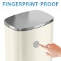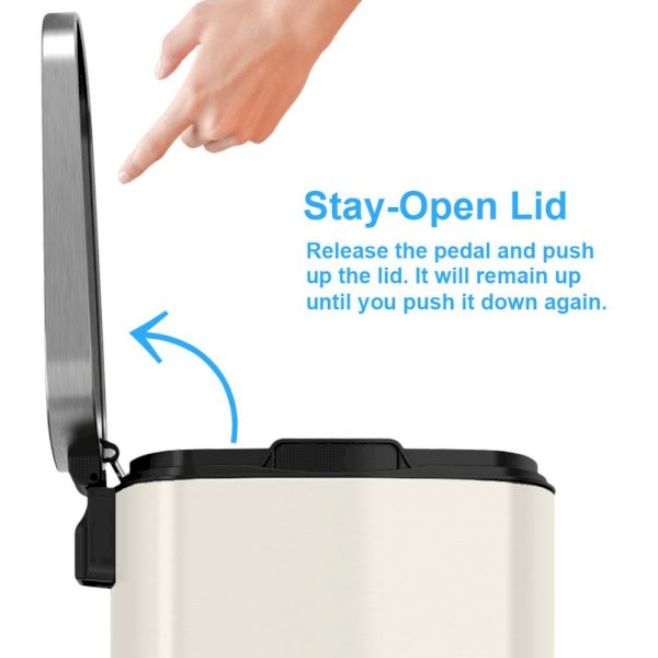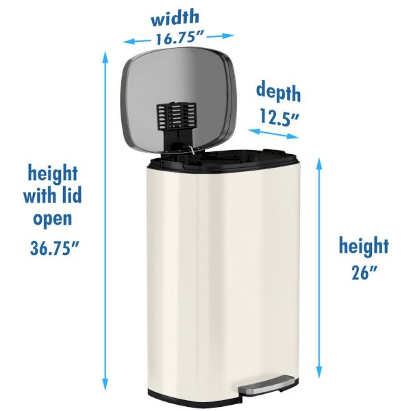 13. 2 Gal./50 l SoftStep Ivory White Stainless Steel Step Trash Can SoftStep is the smoothest, most sophisticated step trash can you will ever own. The ergonomically-designed pedal requires minimal force to operate. The gentle lid close is smooth and silent. The elegant, ivory white stainless steel finish is fingerprint-proof and smudge-resistant, making SoftStep the perfect kitchen trash can. The easy to replace air damper means this step trash can will provide years of like-new performance. The removable inner bucket stops a full, heavy trash bag from falling into the can, and makes taking out the trash quick, easy, and clean. Its ivory white stainless steel finish makes SoftStep the showpiece garbage can you will be proud to have in your kitchen.