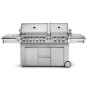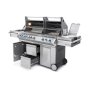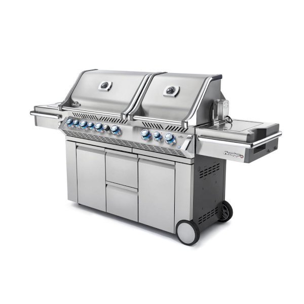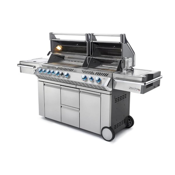 NAPOLEONs Prestige PRO825 with PSIde Burner and Infrared Rear and Bottom Burners is beautiful and spacious, proving that (2) heads are better than 1. On the outside, shining stainless steel body provides durability against even the harshest elements while chrome details add luxury. Night grilling is easy with the blue NIGHT LIGHT control knobs featuring SafetyGlow, which turns knobs red when gas is on. Never worry about accidentally leaving the gas on again. The SafetyGlow knobs have the added benefit of knowing which burners are lit, making it easier to get the perfect sear or the ideal indirect grilling spots. The large main grill head features enough space to grill for a crowd, while providing many different ways to cook. Sear over high heat, bake and roast using indirect heat, use the rear burner for rotisserie meals, and even turn your grill into a smoker with the integrated smoker tube and dedicated smoker burner. The secondary head features (2) ceramic infrared burners that reach high heat in seconds, ideal for searing restaurant quality steaks, or a quick meal for a couple of friends. The Prestige PRO825 has a two-stage power side burner with a reversible cast iron cooking grid, ideal for sauces, saut's, side dishes and more. When reversed, the cooking grid turns into a cradle, perfect for a wok like our Stainless Steel Wok and making the best stir-fries.