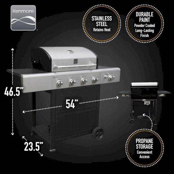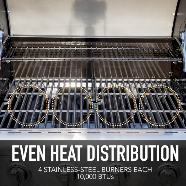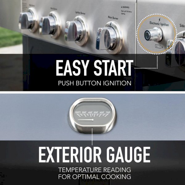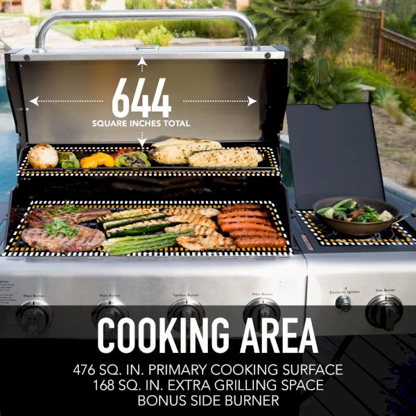 Feed your guests something to savor with this 4 Burner Gas Grill with Side Burner and Stainless Steel Lid. With an impressive 644 sq. in. of cooking space, you'll be able to host all your friends. Cook up a storm with the 4 main burners plus a side burner that reaches up to 13,000 BTU for cooking versatility and convenience. The electronic ignition, storage shelves and easy-to-clean design help you spend less time cooking and more time enjoying the party with your guests.