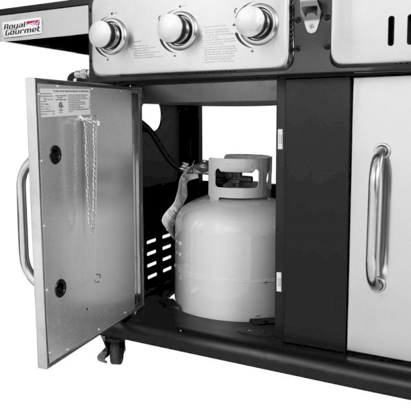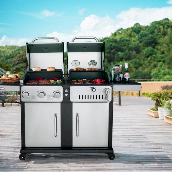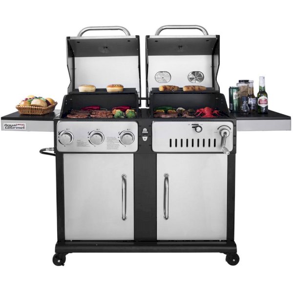 Enjoy the best of both worlds with Royal Gourmet ZH3003S Premium 3-Burner Gas and Charcoal Grill Combo. Large, individual cooking grates of overall 600 sq. in., made of porcelain cast iron, cater for your 24 patties altogether. Porcelain wiring racks provide additional food warming area totaling 209 sq. in. 3 individually controlled burners have an overall output of 27000 BTUs, heating your food at a scorching temperature. Its charcoal firebox features an adjustable charcoal pan to easily lift coals using the spring handle. LP tank as well as other grill items will be secured inside the bottom cabinet with doors to make them dust free. The side tables are great to put on food, condiments, plates and platters, within arms reach and ready for use. Thanks to the dual combination of gas and charcoal fireboxes on this grill, you can select either way to cook your food for an authentic flavor or consistent grilling experience. Pick up 1 and try your first grill combo partner with Royal Gourmet ZH3003S. Celebrate family reunion or friends gathering and let the grill do all the work for you.