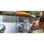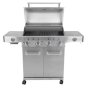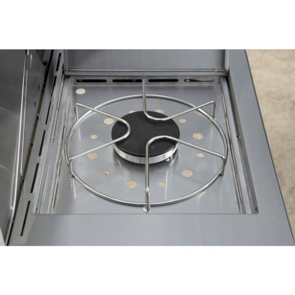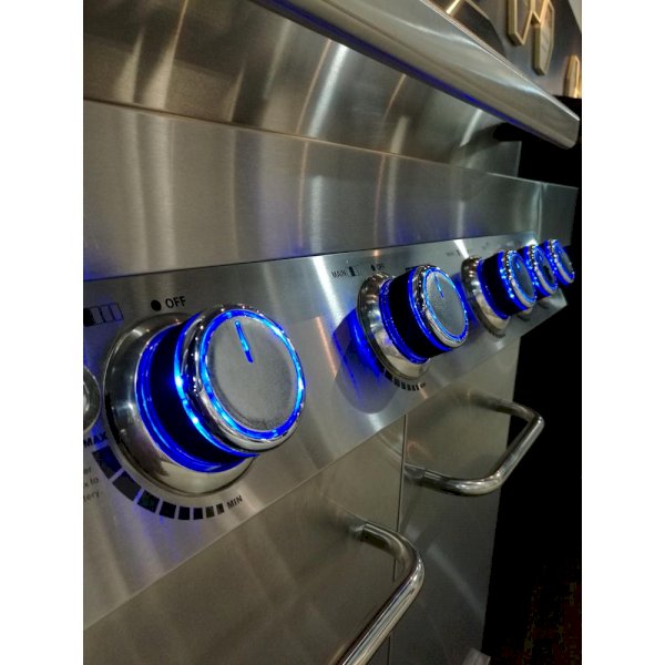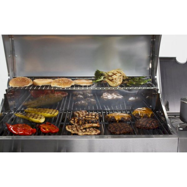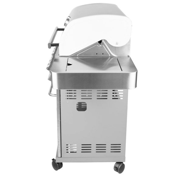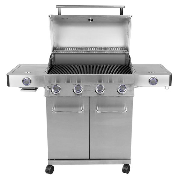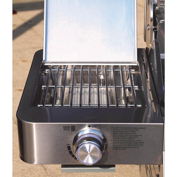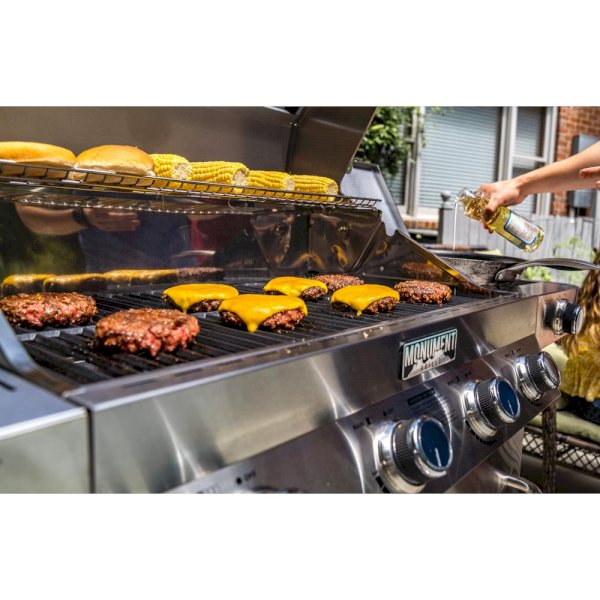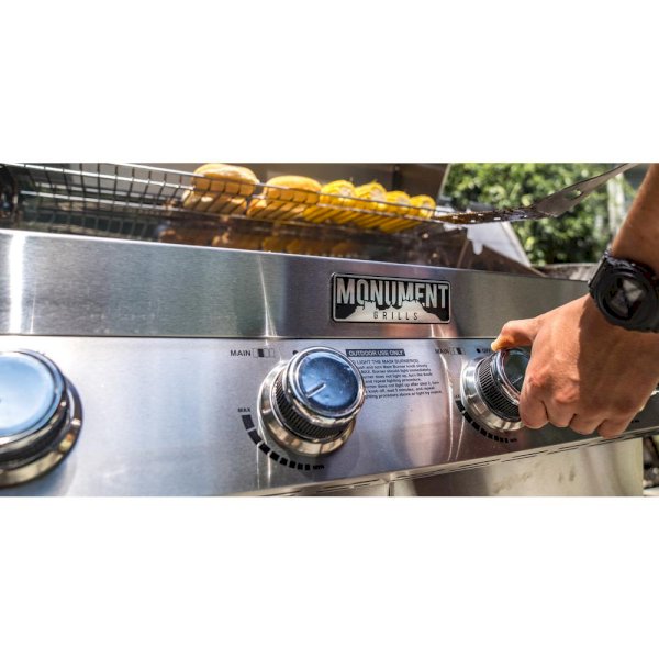 Enjoy the outdoors with friends and family this season cooking on the rugged stainless steel propane gas grill with Cast Iron Side Caps from Monument Grills. Be captivated with the multi-cooking options including 4 main burners, burner and side sear burner. Featuring 4 main stainless steel burners one side burner and one side sear burner, this grill is designed with an electronic ignition for easy starting and delivers up to 72,000 BTUs of cooking power. The porcelain coated cast iron cooking grids delivers Even-Heat across the entire surface for flavor rich cooking and large easy to read thermometer for precise temperature control. Enjoy cooking evening hours with the blue LED back lit control knobs. Easily portable thanks to 4 heavy duty casters that also lock into position when you need it stationary.