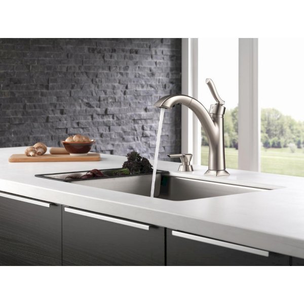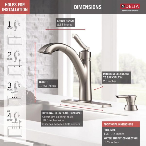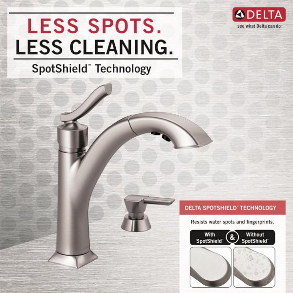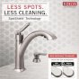 Delta MagnaTite Docking uses a powerful integrated magnet to pull your faucet spray wand precisely into place and hold it there so it stays docked when not in use. Delta SpotShield Technology helps to keep your faucet cleaner, longer by resisting water spots and fingerprints. Keep your space spotless with SpotShield Technology, available across a variety of finishes for the kitchen and bath. Delta faucets with DIAMOND Seal Technology perform like new for life with a patented design which reduces leak points, is less hassle to install and lasts twice as long as the industry standard. Kitchen faucets with Touch-Clean Spray Holes allow you to easily wipe away calcium and lime build-up with the touch of a finger. You can install with confidence, knowing that Delta faucets are backed by our Lifetime Limited Warranty. Industry standard is based on ASME A112.18.1 of 500,000 cycles.