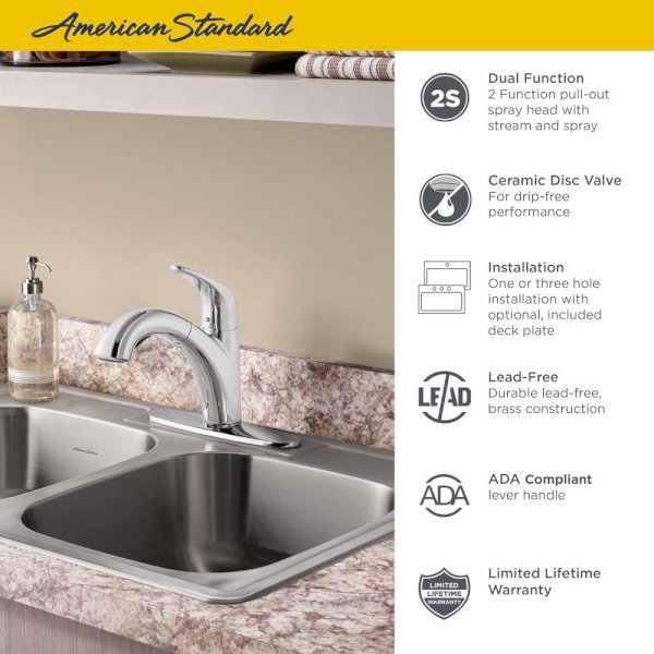 The Colony Pro pullout kitchen faucet from American Standard is ready to make your day-to-day life easier in the kitchen. Featuring a refined, elegant design, offered in 2 beautiful finishes, the Colony Pro pullout kitchen faucet is an easy choice to update your kitchen. This stand-out faucet is easy to install, and has a water-saving flow rate of 1.5 GPM without sacrificing great performance, and includes great features such as our hot limit safety stop that helps to prevent accidental scalding.