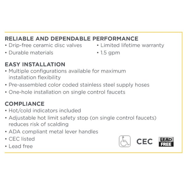 Certifications and Listings | ADA Compliant,ANSI Certified,CSA Certified,CSA Listed,NSF Certified,NSF Listed |