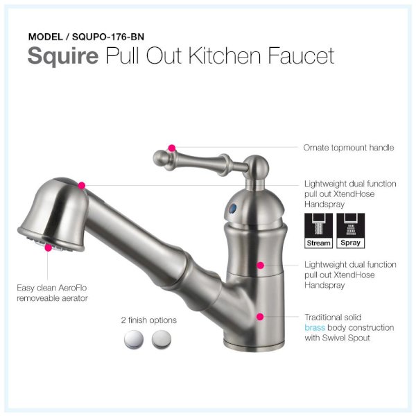 Flare your kitchen with Traditional style with the Squire Pull Out Kitchen Faucet in Brushed Nickel (SQUPO-176-BN). The Squire features a lightweight pullout hand spray with dual function spray/stream water control. The hand spray is fitted with a removable and easy to clean AeroFlo aerator and provides an Eco-Friendly 1.75 GPM flow. It is connected to our UltraBraid hybrid stainless steel-nylon hoses, allowing the hand spray to reach beyond the edge of your sink. Easily fill pots or cleaning buckets outside of your sink with the flexibility of XtendHose. HOUZER'S quick connect interlock system and oversized locknut provide easy installation and durability to last for a lifetime. The Squires ornate traditional styled top mount water control handle is precision engineered for ultra-smooth Omni-directional gliding for precise temperature and flow control. Fitted with HOUZER'S CeraDox Ceramic Disc Cartridge guarantees a lifetime of leak proof operation. The Squire Pullout Kitchen Faucet is manufactured with the latest technology in the art of metallurgy and crafted with raw molten brass from start to finish in our ISO certified HOUZER Factory in Israel. More than just a brand name, as a manufacturer we have over 70 years of experience in faucet craftsmanship. This gives HOUZER the confidence to stand by our Lifetime Warranty on all our faucets. All HOUZER faucets are ICC certified to meet or exceed all US State and Federal plumbing codes and low lead safety standards.