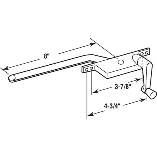 This casement window operator is a right handed aluminum square body type. It has a 8 in. steel arm with a round disc on the tip (some older styles had a small wheel instead of a disc). The disc slides in the Prime-Line part H 3529 casement track located on the bottom of the casement window. It is worm gear driven by a 3/8 in. crank spindle. The matching crank handle that fits onto the crank spindle and installation screws are included. Mounting holes available are 3-7/8 in. and 4-3/4 in. apart.