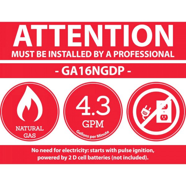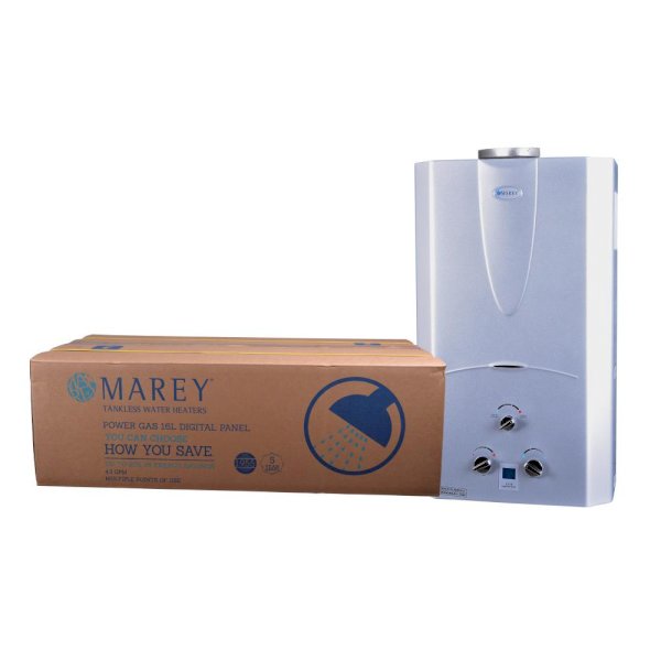 The MAREY GA16NGDP Indoor Natural Gas Tankless Water Heater can provide up to 4.3 Gal. per minute for a perfect shower at 115°F output water temperature. You can see your output water temperature trough a digital panel, making easy to adjust the water and gas flow to your desired output temperature It is also called water heater on demand, because it heats water only when needed, saving energy. It is designed in the USA and it's perfect to supply endless hot water for up to 3 or 4 points of use simultaneously (for a variety of residential hot-water applications). Its compact design saves space and is easy to install: you will only need 2-D cell battery for the ignition and a venting (not included in the box). MAREY has been on the water heating business since 1955, bringing tradition and innovation together.