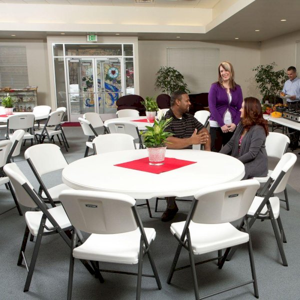 Lifetime 60 in. Round Commercial Folding Tables are constructed of high-density polyethylene and are stronger, lighter and more durable than wood. The innovative nesting design lets multiple table stack together for space saving storage. They will not crack, chip or peel, and are built for indoor and outdoor use. The patented steel frame design provides a sturdy foundation and is protected with a powder-coated, weather-resistant finish. Perfect for banquets, meetings or events, Lifetime 60 in. Round Folding Tables are built for the rigors of demanding commercial use and exceed challenging BIFMA standards.