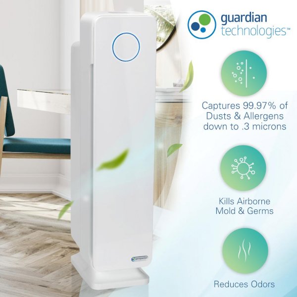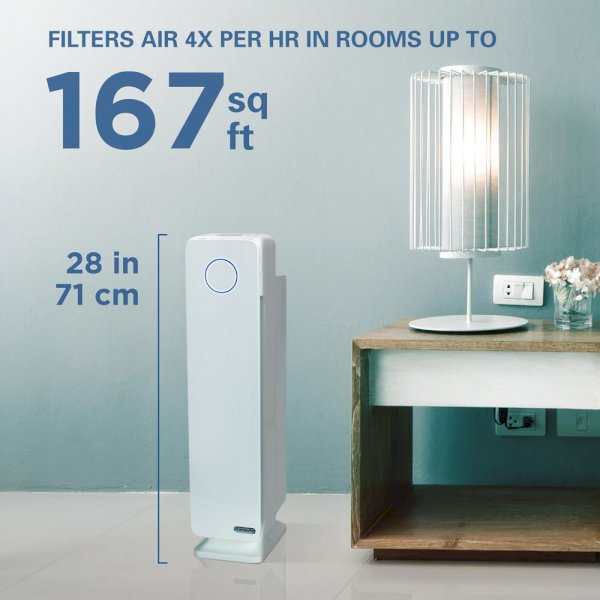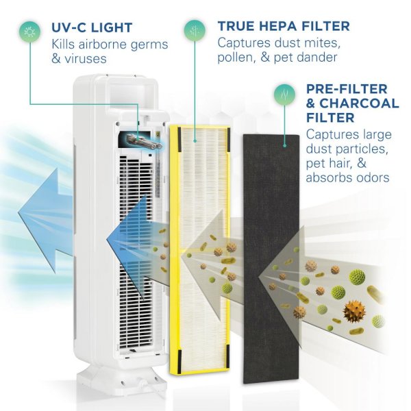 The 4-in-1 Air Purifier is perfect for allergy sufferers. With a True HEPA filter, it captures 99.97% of dust and allergens as small as .3 microns in size! More than just a filter, the UV-C light kills germs, while the charcoal filter captures odors. CADR Rated 125+ and standing 28 inches tall, it is lightweight and ideal to use in both medium to large rooms. The easy to use digital display panel includes UV-C control, a filter change indicator and an up to 8 hour timer. 5 speeds provide high speed allergen control down to ultra-quiet sleep mode. The Elite Collection provides both form and function to provide a superior air cleaning system. The simple, stylish design looks great in any home environment.