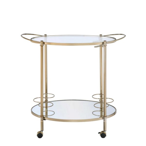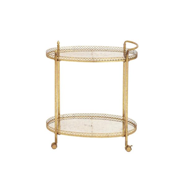 2-Tiered Iron and Glass Oval Wheeled Bar Cart in Polished Gold Brass