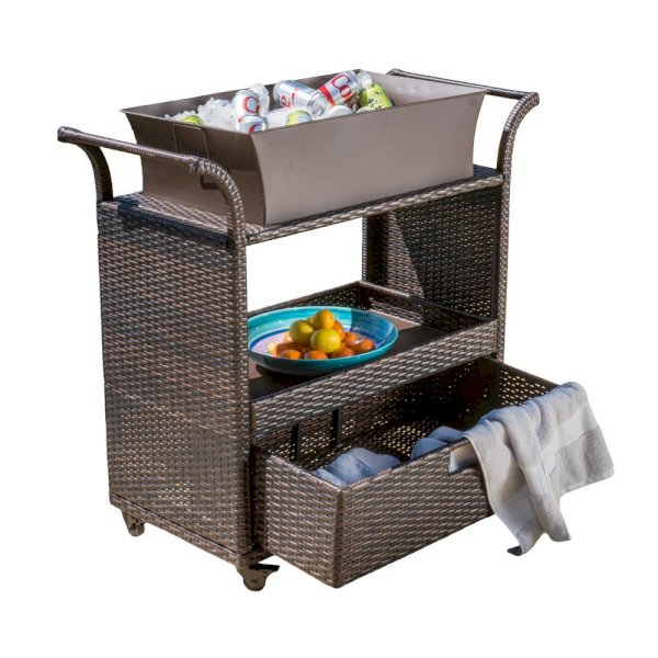 Kolten Multibrown Wicker Bar Cart with Ice Bucket and Drawer