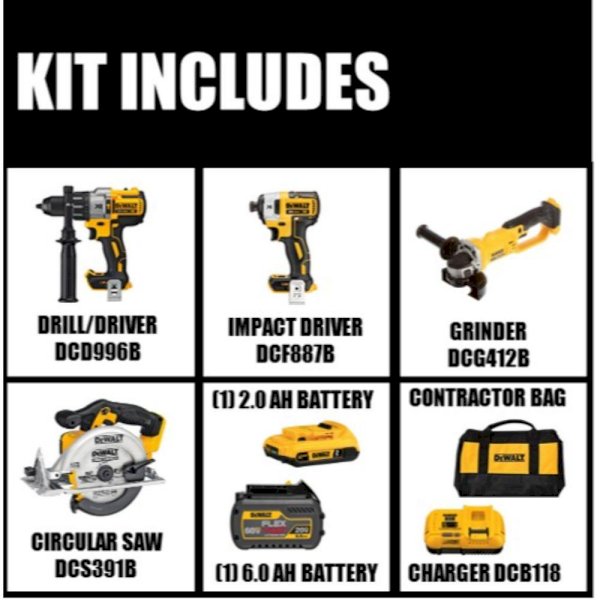 The DEWALT DCK299D1T1 20-Volt MAX FLEXVOLT Brushless premium Hammer drill and Impact Combo Kit features FLEXVOLT technology; the world's first battery that automatically changes voltage when you change tools. The DEWALT DCK299D1T1 is a versatile combo kit that is ideal for most drilling, hammering and fastening applications. For a limited time get a bonus Bare Grinder and Circular Saw with purchase.